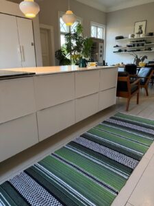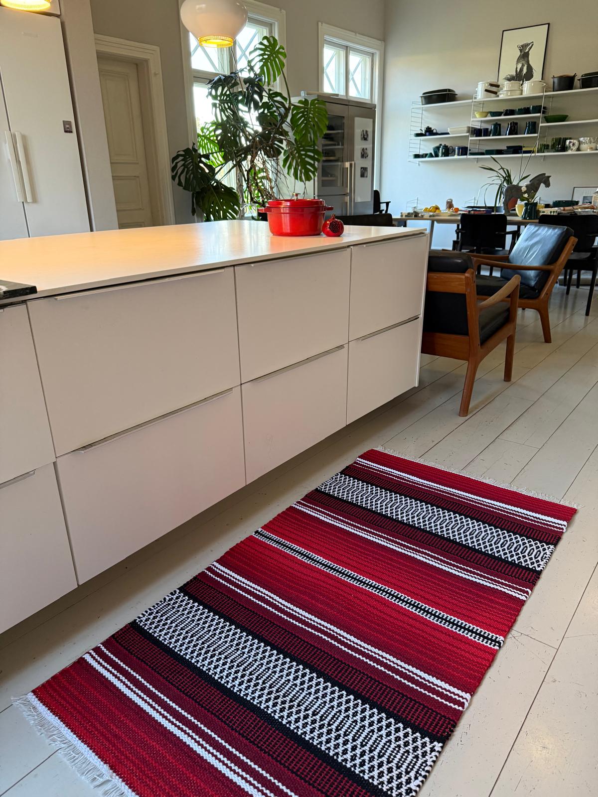 Tilasin kaksi räsymattoa. Nyt käytössä keltainen ja jouluksi valmiina punainen. En ole mikään mattoihminen mutta nähin ihastuin heti. Moderni versio isomummun räsymatosta. Bläkki the Mainecoon cat myös rakastui uuteen mattoon.